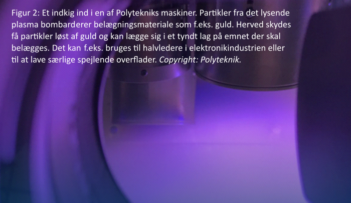 Vi fortæller jo ikke, hvad der præcist er hemmeligheden ved vores belægningsproces. Men det er noget med magnetfeltet, siger Susanne, og fortsætter: Vi lægger et stykke metal ind i maskinen og bombarderer det med gassen argon. Herved frigives ioner, der er positivt ladede, og vores magnetfelt i maskinen fører disse ned på spejlformen. Vi kan styre det ret godt, og lave et fint, fint mikrometer-tyndt lag