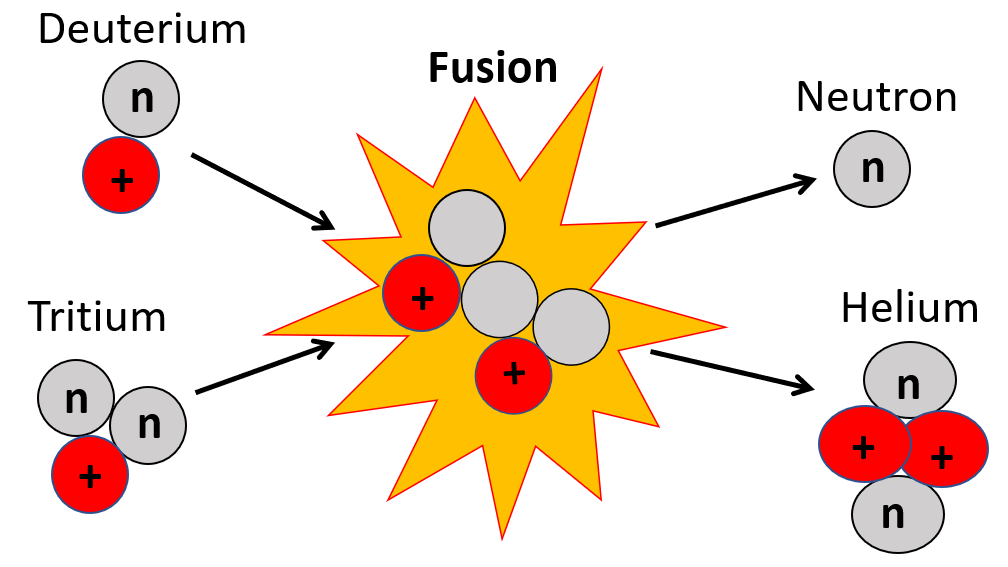 Fusion er den fysiske proces, der konstant sker i Solen og mange andre stjerner. Nye, tungere grundstoffer dannes, når lette grundstoffer smelter sammen. I denne proces frigives der energi. Illustrationen ovenfor viser, hvordan deuterium og tritium fusionerer og bliver til helium og en neutron.