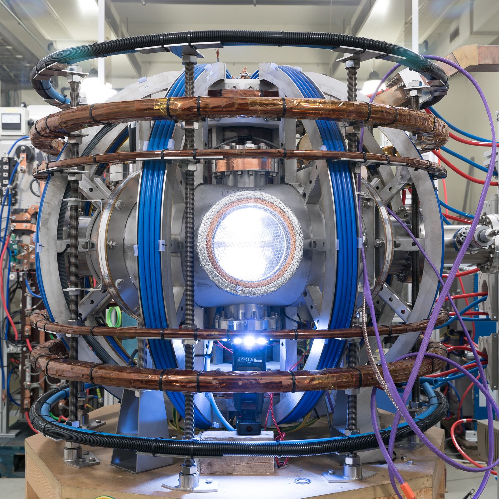 NORTH er navnet på den eneste tokamak i Skandinavien, som lige nu befinder sig på DTU i Kgs. Lyngby. Et ældre fotografi af NORTH under et plasmaskud ses øverst.